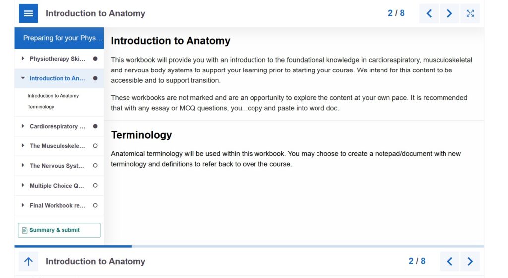 Anna and I then began the task of identifying the content to be included within each H5P workbook. This was a somewhat challenging task as we needed to ensure that all resources were accessible and delivered to the appropriate level for apprenticeship students. Topics related to the physiotherapy profession alongside an introduction to each main speciality were identified and work began in earnest to complete! There were regular meetings to align resources within the team and ensure we were on track to achieve our completion date of June 2025.