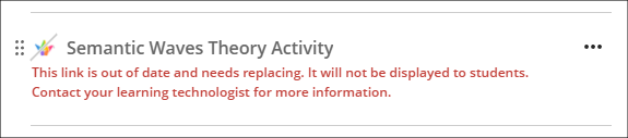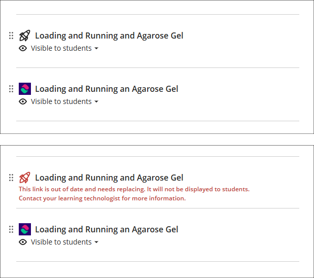 A LearnSci resource added using the LTI 1.1 will look like the first link in the screenshots below, with the rocket next to the title. A LearnSci resource added using the LTI 1.3 will look like the second link, with the LearnSci icon next to the title. Once the LTI 1.1 is switched off the old links will appear to staff with a ‘This link is broken’ message and will be automatically hidden from students. LTI 1.3 links will be unaffected.